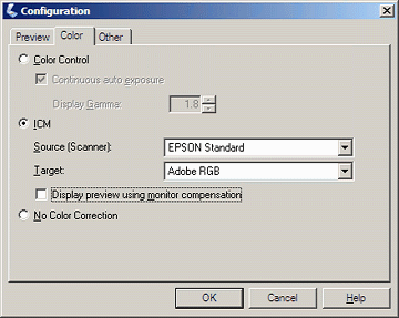 For the Epson 3200 flatbed scanner, the Configuration dialog box, shown on the right, is opened by clicking Configuration... in the main window. If you have a trustworthy custom profile for your scanner, you should enter it in the Source (Scanner): box. The Epson Standard (default) profile is shown.If the custom profile is not visible, go to Control Panel, double-click on Scanners and Cameras, right-click on your flatbed scanner, click Properties, then click on the Color management tab. Click then select the custom profile. (A lotta steps!) Target: contains the output profile for the scan. Adobe RGB is recommended in most cases because its gamut exceeds that of most high quality printers: sRGB (the default) may not be sufficient. Make sure to select the same Color space for the scanner in the Print test input dialog box. Note: this profile is not embedded in the scanner output. This is a deficiency in the Epson scanner software: almost a bug (though a common bug; it appears in many cameras and raw converters.). You need to remember the profile and embed it in the file without changing the image data. See Assigning a profile, above. |