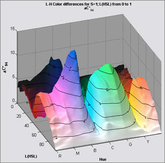 3D HL color difference plots are extremely valuable for visualizing color response because they are clear and visually striking. They can display any of a large number of color difference metrics. The plot on the right shows ΔE*94 with HSL H and L as the independent axis. Several ΔE* and ΔC* metrics can be chosen. The ΔC* metrics do not include luminance L* in their calculation. The display on the right shows large values of ΔE*94 (> 15) for light greens and cyans. Much of this difference is apparently due to a darkening of the light greens. The difference is much lower in the ΔC*94 plot below. Note that the vertical scaling has changed. |